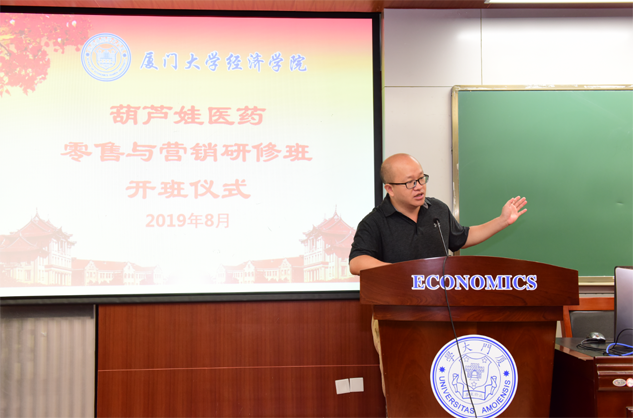 在开班仪式上,廖景峰主任首先代表厦门大学经济学院热烈欢迎门徒娱乐医药零售与营销研修班的学员到厦大学习,并就厦门大学及经济学院的相关情况进行了介绍。他说,门徒娱乐学员走进厦大就是厦大的校友,希望未来的日子能够关心、支持母校的发展,多提宝贵意见,同时他也祝大家在厦大学习期间学有所成、学有所获。